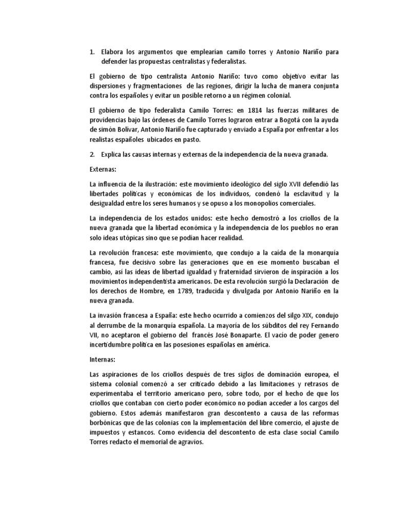 Elabora Los Argumentos Que Emplearian Camilo Torres Y Antonio Narino Para Defender Las Propuestas Centralistas Y Federalistas Pdf Gobierno Agitacion